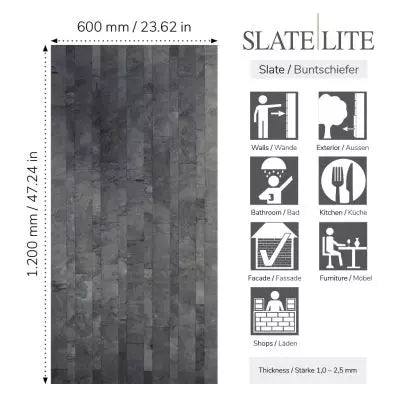 Slate-Litewird aus Schichtgestein hergestellt. Farbunterschiede in den einzelnen Platten sowie Quarzadern, die sich durch den Stein ziehen, natürliche Risse oder leichte Absplitterungen können vorkommen. Dies ist kein Mangel, sondern vielmehr einMerkmal der echten Natursteinoberflächeund macht jedes Steinblatt vonSlate-Litezu einemabsoluten Unikat!
