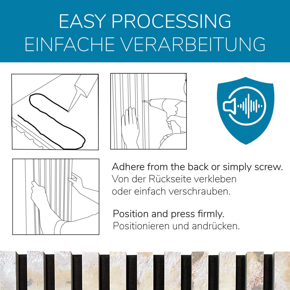 Die innovativen Akustikpaneele vonSlate-Litebringen nicht nur Ruhe in Ihre Räume, sondern setzen auch einzigartige Designakzente. Anstelle der herkömmlichen Holzoptik bietet dieses Akustikpaneele etwas ganz Besonderes: eine 100% natürliche Steinoberfläche! Die dünnen Steinfurniere vonSlate-Litewerden präzise auf die Latten der Paneele verpresst und verwandeln jedes Element in ein echtes Unikat. Ein Paneel hat die Masse 60x60 cm. Zusätzlich wird ein 2 cm breiter Streifen des Absorptionsuntergrunds beigelegt, sodass Sie die Wahl haben, die Paneele Stoss an Stoss oder mit Abstand anzubringen.