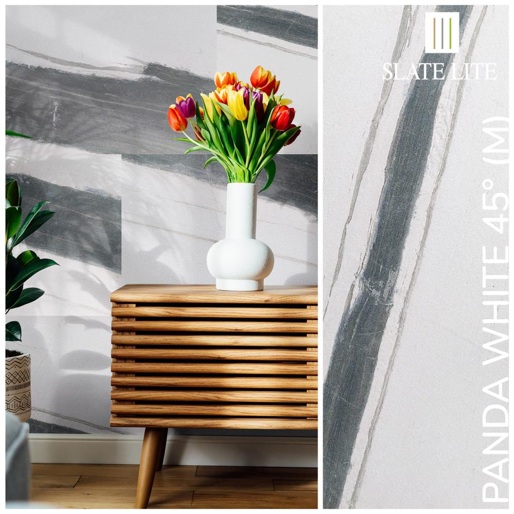 Panda White 45°ist ein helles Dekor mit weiss-grauer Grundfarbe und dunklen Kontraststreifen. In der Variante 45° verlaufen die Streifen aufsteigend.