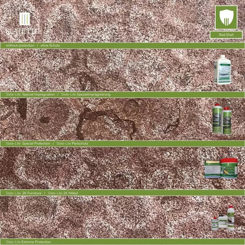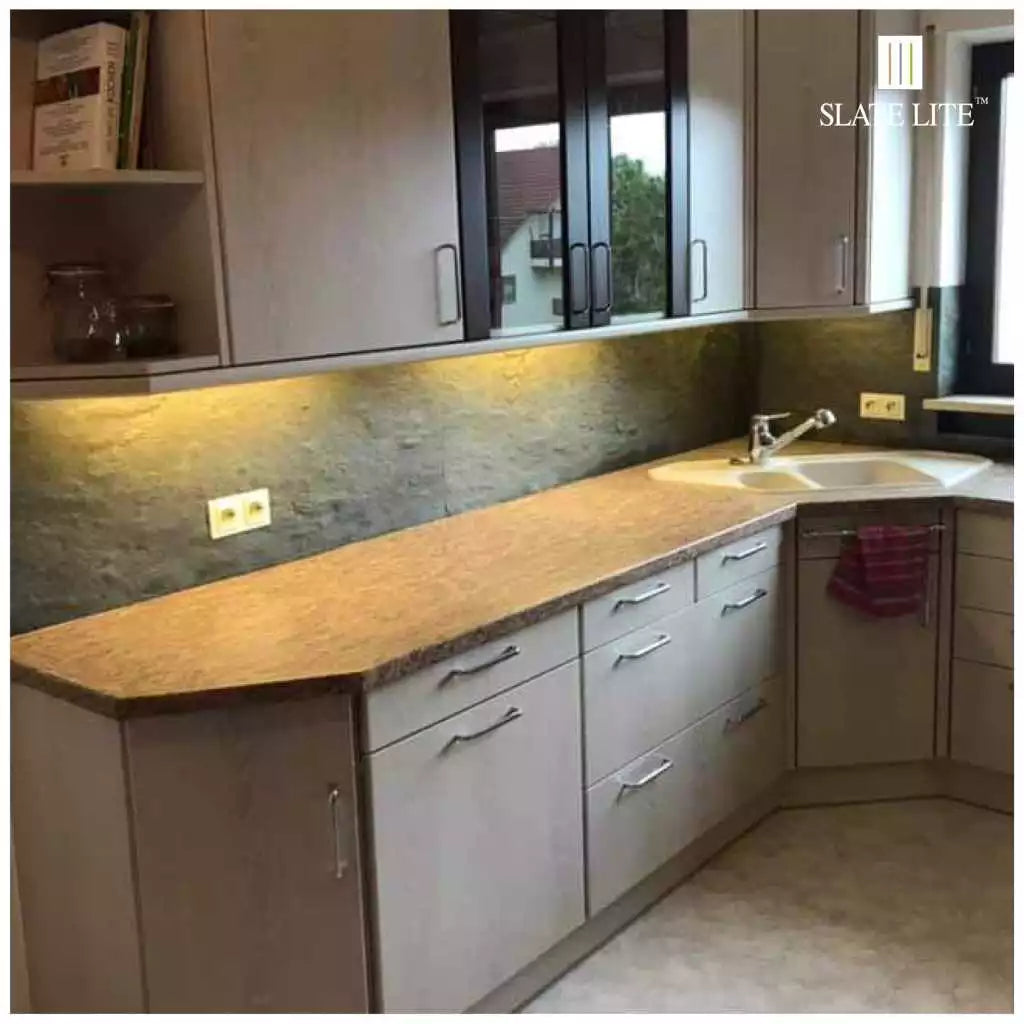 Slate-Litewird aus Schichtgestein hergestellt. Farbunterschiede in den einzelnen Platten sowie Quarzadern, die sich durch den Stein ziehen, natürliche Risse oder leichte Absplitterungen können vorkommen. Dies ist kein Mangel, sondern vielmehr einMerkmal der echten Natursteinoberflächeund macht jedes Steinblatt vonSlate-Litezu einemabsoluten Unikat!