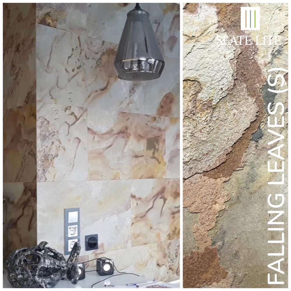 FALLING LEAVES ist ein helles Dekor mit vielen Strukturen in Gelb-, Braun- und Rottönen. Bei kaum einem Dekor zeigt sich so deutlich, dass jedes Steinblatt vonSlate-Liteein absolutes Unikat ist: Die stetig wechselnden Strukturen und unterschiedlichen, warmen Farben erinnern an buntes Herbstlaub und lassen auch nach langer Zeit immer wieder neue Muster entdecken. Wer spannenden, farbenfrohe Mustervielfalt mag, wird dieses Dekor lieben - ganz gleich ob in Geschäftsräumen, einer Bar oder Restaurant oder im privaten Bereich:Falling Leavesgehört zu unseren absoluten Bestsellern dank der naturnahen Farben und abwechslungsreichen Steinstrukturen!